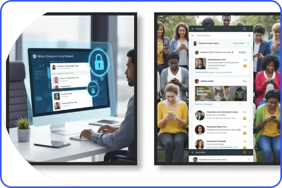 برای مثال، در یک شبکه عمومی ممکن است پستها یا دادههای کاری به راحتی در معرض دید عموم قرار گیرد، اما در شبکه سازمانی مانند نکسوس، تمام ارتباطات و محتوا در محیطی کنترلشده و هدفمند مدیریت میشود.
